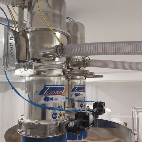 Trasporto pneumatico in depressione in fase fluida: Una vera innovazione riportata nel sistema di trasporto e movimentazione dei prodotti alimentari è presentata dalla Davari Engineering, il nuovo sistema denominato turbo vacuum. Il principio di funzionamento di turbo vacuum è differente dai vecchi sistemi finora proposti, in quanto il prodotto è trasportato in fase fluida da un flusso di aria modulante lungo apposite tubazioni. PRINCIPIO DI FUNZIONAMENTO: La linea turbo vacuum essenzialmente è composta da due gruppi principali: - Gruppo pompa di aspirazione ad alta efficienza serie “TV-P” oppure (pompe a venturi serie “TV-V”). - Gruppo ciclonico (serie “TV-S” versione compatta) oppure (serie “TV-M” versione modulare) Il gruppo pompa di aspirazione ad alta efficienza serie “TV-P” crea una forte depressione all’interno del gruppo ciclonico serie “TV-S”, che mediante la tubazione di collegamento e un’apposita postazione di carico aspira il prodotto all’interno del gruppo ciclonico. Quando la tramoggia del gruppo ciclonico ha raggiunto il livello impostato, viene interrotto il flusso di aspirazione facendo cessare la depressione nel circuito, si apre l’apposita valvola di scarico lasciando cadere il prodotto all’interno della macchina asservita. Nel frattempo viene pulito il filtro posto all’interno del gruppo camera filtrante posto direttamente sopra il gruppo ciclonico. I tempi di carico scarico e pulizia del filtro ecc. sono tutti regolabili tramite l’apposito software di gestione. La velocità di trasferimento è costantemente controllata da un sistema automatico, e comunque regolabile tramite il software di controllo. Questa nuova tecnologia evita la compattazione del prodotto e/o formazione di polveri o grumoli. Altra importante caratteristica del sistema è quella di rendere il prodotto arieggiato, soffice e scorrevole oltre ad essere raffreddato in fase di trasferimento. I vantaggi nell’utilizzo del trasportatore turbo vacuum si evidenziano particolarmente nel trasporto di prodotti difficili con alto tenore di umidità e grassi, che devono mantenere il loro aspetto scorrevole dopo il trasferimento, alcuni esempi di prodotti trasportati come il formaggio grattugiato fresco, cacao in polvere, pane grattugiato, zucchero, funghi, prodotti granulati e/o cubettati rendono l’idea di flessibilità del sistema. I vari collegamenti tra il gruppo pompa di aspirazione  e gruppo ciclonico con punto di prelievo materiale, sono eseguiti con l’ausilio di tubi in acciaio inox e/o dei tubi flessibili trasparenti, completi di flangie a sgancio rapido per garantire un rapido smontaggio. Con questo sistema è possibile trasferire il prodotto all’interno delle apposite tubazioni in qualsiasi punto dello stabilimento, con distanze importanti anche fino a 100 ml, permettendo di passare anche attraverso diversi reparti di produzione. Le pareti Interne delle tubazioni dedicate al trasferimento del materiale a contatto con il prodotto, possono essere facilmente sanificate con il nostro sistema denominato “easyclean” oppure tramite un circuito automatico “CIP” di lavaggio di nostra produzione.